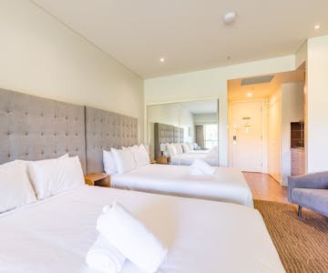 Our 45 sqm Family Suites blend contemporary style with modern comforts, ideal for a relaxing stay. Each suite features two queen beds, a private ensuite, a flat-screen TV, a fully equipped kitchenette, in-room laundry facilities, and a separate lounge and dining area. Step out onto your private balcony and enjoy tranquil garden views, while being just moments from the Royal Botanic Gardens, the scenic Yarra River, and Melbourne’s vibrant Southbank precinct, offering easy access to top dining, shopping, and cultural attractions.